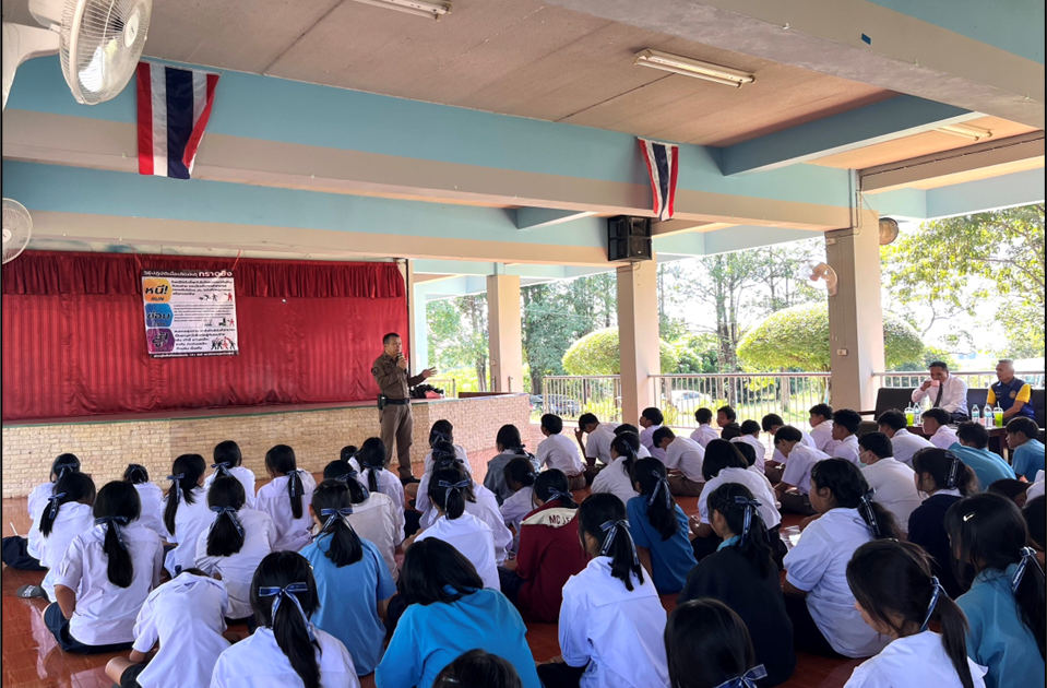 วันที่ (18 พ.ย. 2567) เวลา 12.30 น. ภายใต้การอำนวยการของ พ.ต.อ.ชาญชัย หาแก้ว ผกก.สภ.ไทรย้อย , พ.ต.ท.สุทธิพงษ์ สารพานิช รอง ผกก.ป.ฯ โดย พ.ต.ท.อยู่คง กาวิน สวป.ฯ ร.ต.ท.สุชาติ ปาดจัก รอง สว.(ป.)ฯ พร้อมชุดสายตรวจรถยนต์ 20 , ชุดสืบสวน , ชุดปกครอง , คณะแพทย์จาก รพ.เนินมะปราง และคณะครู ร่วมกิจกรรม หนี ซ่อน สู้ , ตรวจปัสสาวะหาสารเสพติดในนักเรียน , เปิดโรงเรียน เปิดโรงรถ ณ โรงเรียนไทรย้อยพิทยาคม ต.ไทรย้อย อ.เนินมะปราง จ.พิษณุโลก