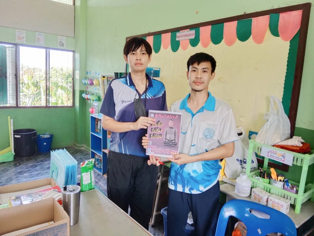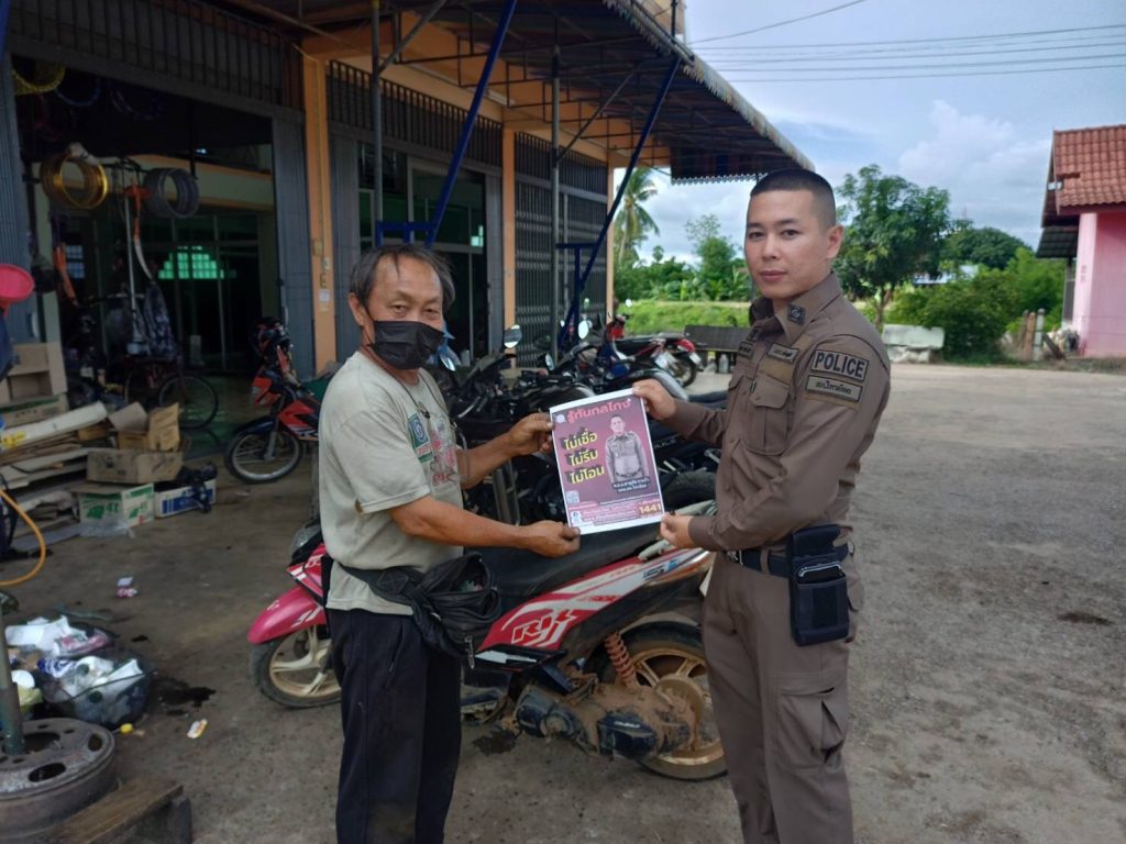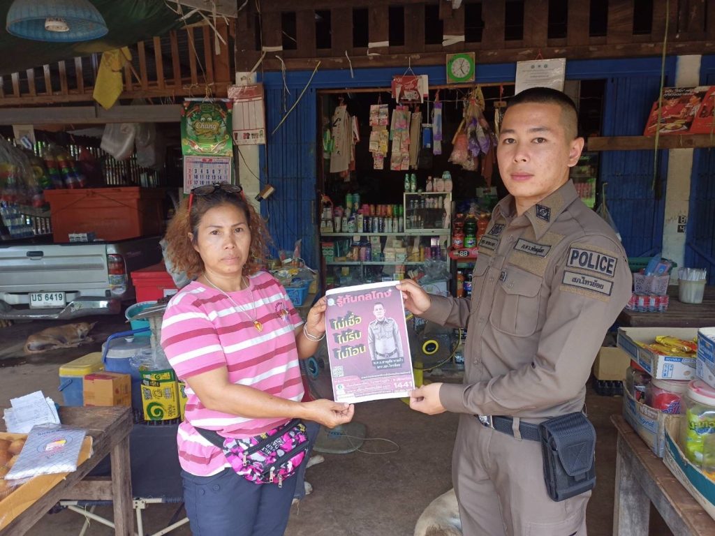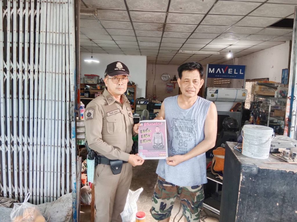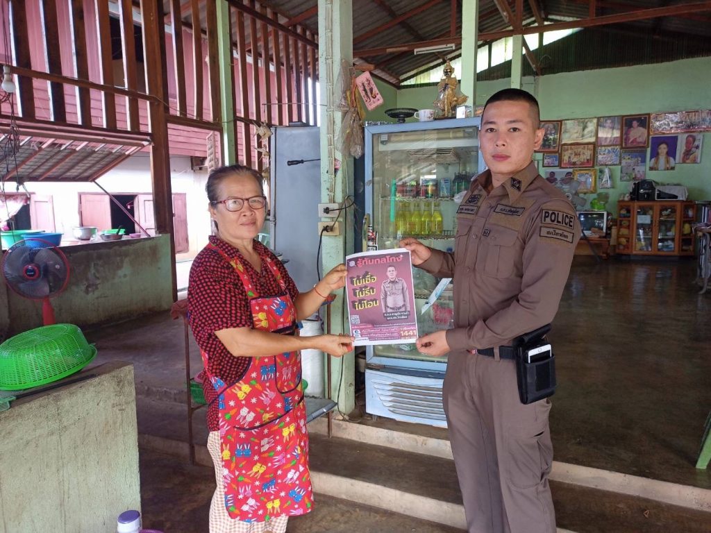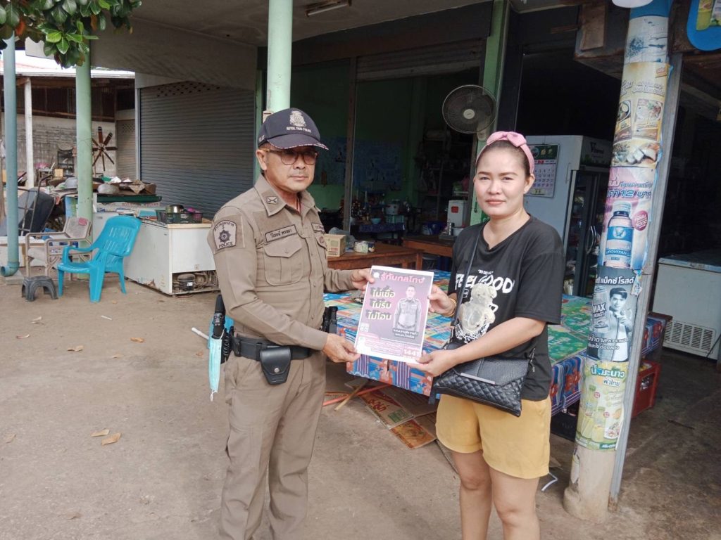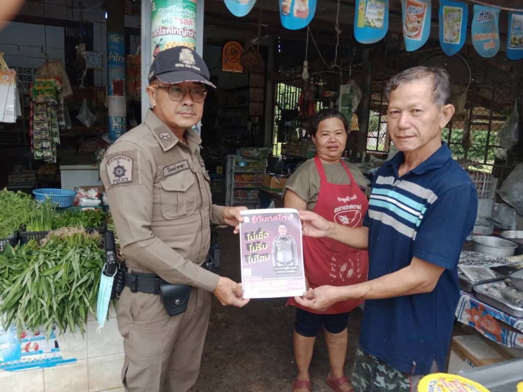 วันนี้ 7 กรกฎาคม 2566 เวลา 9.00 น. ภายใต้การอำนวยการของ พ.ต.อ.ชาญชัย หาแก้ว ผกก.สภ.ไทรย้อย, พ.ต.ท.สุทธิพงษ์ สารพานิช รอง ผกก.ป.สภ.ไทรย้อย, พ.ต.ท.อยู่คง กาวิน สวป.สภ.ไทรย้อย ได้มอบหมายให้ร.ต.ต.ธนัญชัย มากมิ่ง รอง สว.(ป)สภ.ไทรย้อย ร้อยเวร 20 พร้อมชุดสายตรวจร่วมกับงานสอบสวน ลงพื้นที่ประชาสัมพันธ์ เรื่อง ‘รู้ทันกลโกง ไม่เชื่อ, ไม่รีบ, ไม่โอน’ ให้แก่ประชาชนในพื้นที่ในเขตรับผิดชอบ