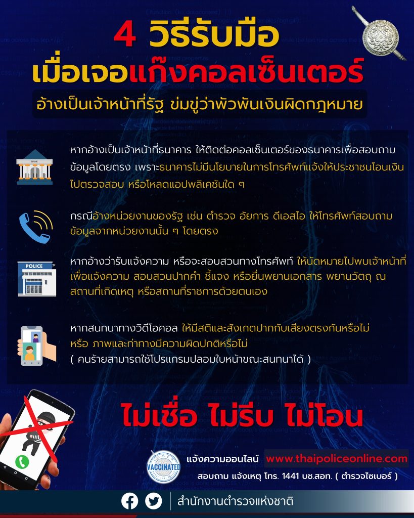 * หากอ้างเป็นเจ้าหน้าที่ธนาคารให้ติดต่อ call center ของธนาคารเพื่อสอบถามข้อมูลโดยตรง เพราะธนาคารไม่มีนโยบายในการโทรศัพท์แจ้งให้ประชาชนโอนเงินไปตรวจสอบ หรือโหลดแอปพลิเคชันใด ๆ