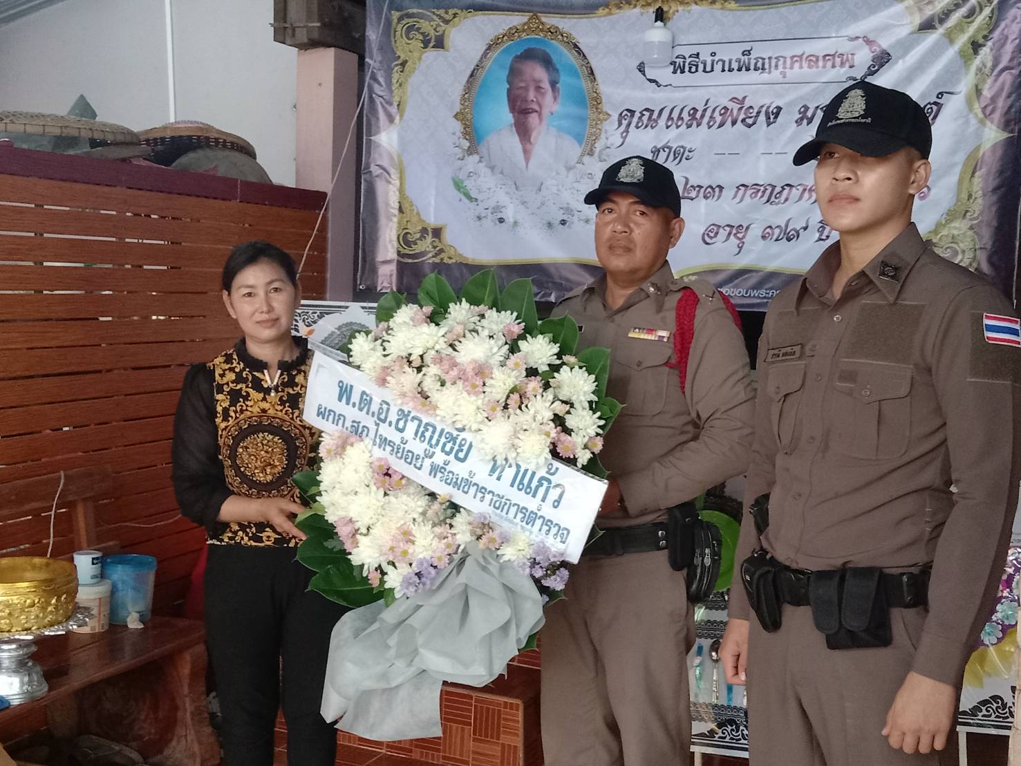 ข้าราชการตำรวจ สภ.ไทรย้อย มอบพวงหรีดดอกไม้งานศพนางเพียง มากะนัต แม่ยายของ นายเพียว ขุนทอง นายกองค์การบริหารส่วนตำบลวังยาง